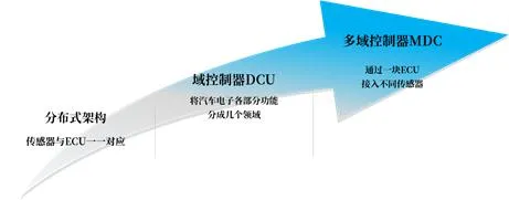 在汽车行业新四化的趋势下,汽车智能化的进程中车辆电子电气架构从分散到集中,催生域控制器的发展。汽车智能网联化带来信息流大量增加,也让电子控制单元(ECU)数量越来越多,汽车电子电气(EE)架构将迎来升级,汽车架构从分布式-域集中式-中央计算式逐渐进化,控制功能迅速集中,以域为单位的DCU(域控制器)集成化架构正式走上历史舞台。